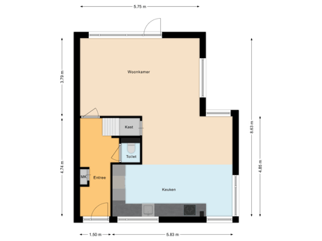 - 96 m² (11,15 meter diep en 8,60 meter breed)