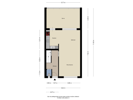 Entree in de hal met toegang tot het toilet, de kelder en de woonkamer. De lichte en zonnige doorzonkamer is voorzien van een moderne pvc-visgraatvloer. Aan de achterzijde is ruimte voor een grote eettafel en bevindt zich de moderne open keuken in hoekopstelling, uitgerust met een inductiekookplaat, vaatwasser, koelkast en diepvries. Vanuit de keuken is er een deur naar de tuin.