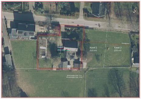 Een kaart zonder maten die de ligging van de percelen aangeeft. Bevat grenzen en perceelnummers.