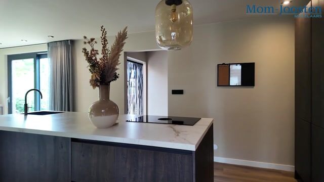 De luxe open keuken vormt het hart van het huis en is voorzien van hoogwaardige inbouwapparatuur en een fraai kookeiland—een plek waar koken en samenzijn vanzelf samenkomen. De aanwezigheid van onder andere airconditioning, een doorkijkhaard en een schuifpui naar de tuin zorgen voor extra comfort en een fijne verbinding tussen binnen en buiten.