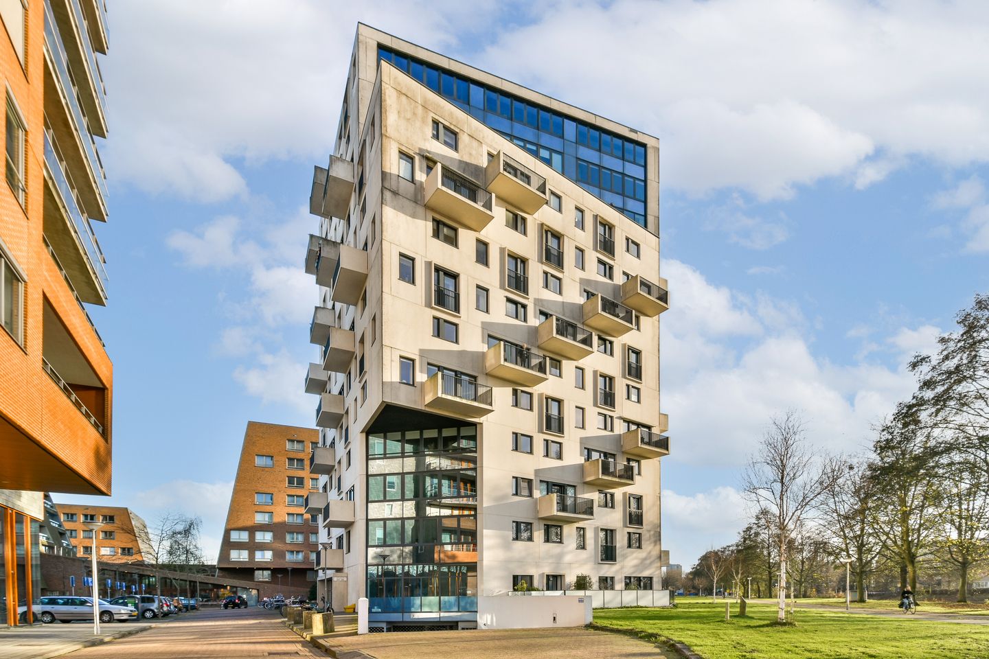 On the other side of the apartment is the master bedroom with an spacious ensuite bathroom. The luxurious bathroom features a double walk-in shower, a designer radiator, and an exclusive bathroom cabinet with double sinks made of frosted glass. All faucets and showers are from the high-quality brand Grohe. The master bedroom has a French balcony with views of greenery, water, and Diemen. The second bedroom is currently used by the owners as a walk-in closet and office.