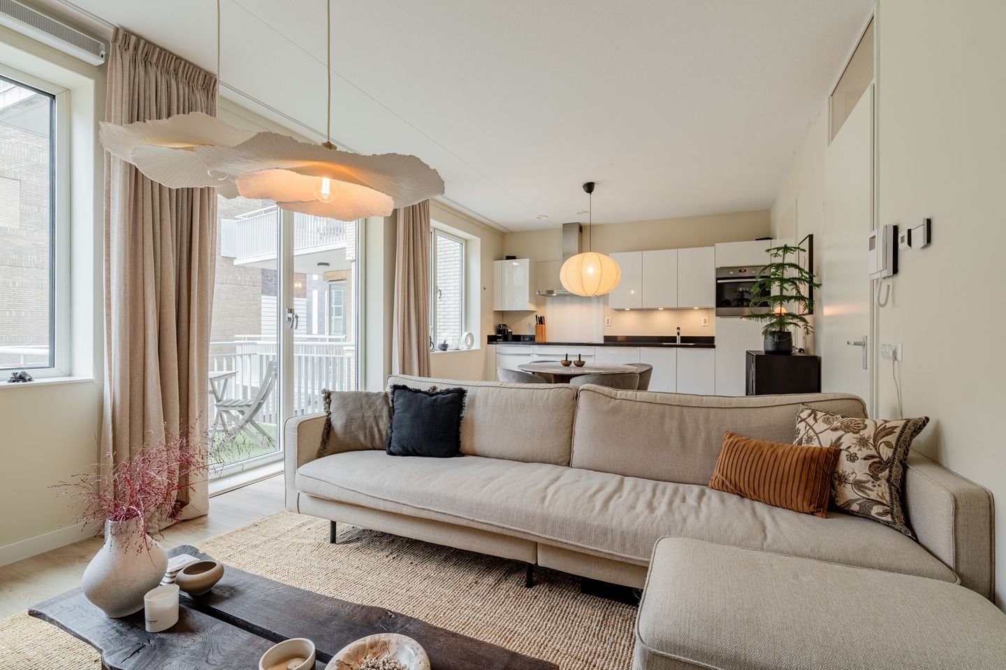 The living room has large windows with patio doors in the middle that give you access to the sunny balcony facing south. This means there is a lot of natural light. The living room also gives you access to the open kitchen. The kitchen is equipped with various built-in appliances such as: an induction hob, extractor hood, refrigerator, dishwasher and combi oven. The two bedrooms are located at the front of the house. Then we have the modern bathroom, which is fully tiled and equipped with: a walk-in shower, washbasin with furniture and underfloor heating. The entire house has smooth plastered walls, a laminate floor and underfloor heating.