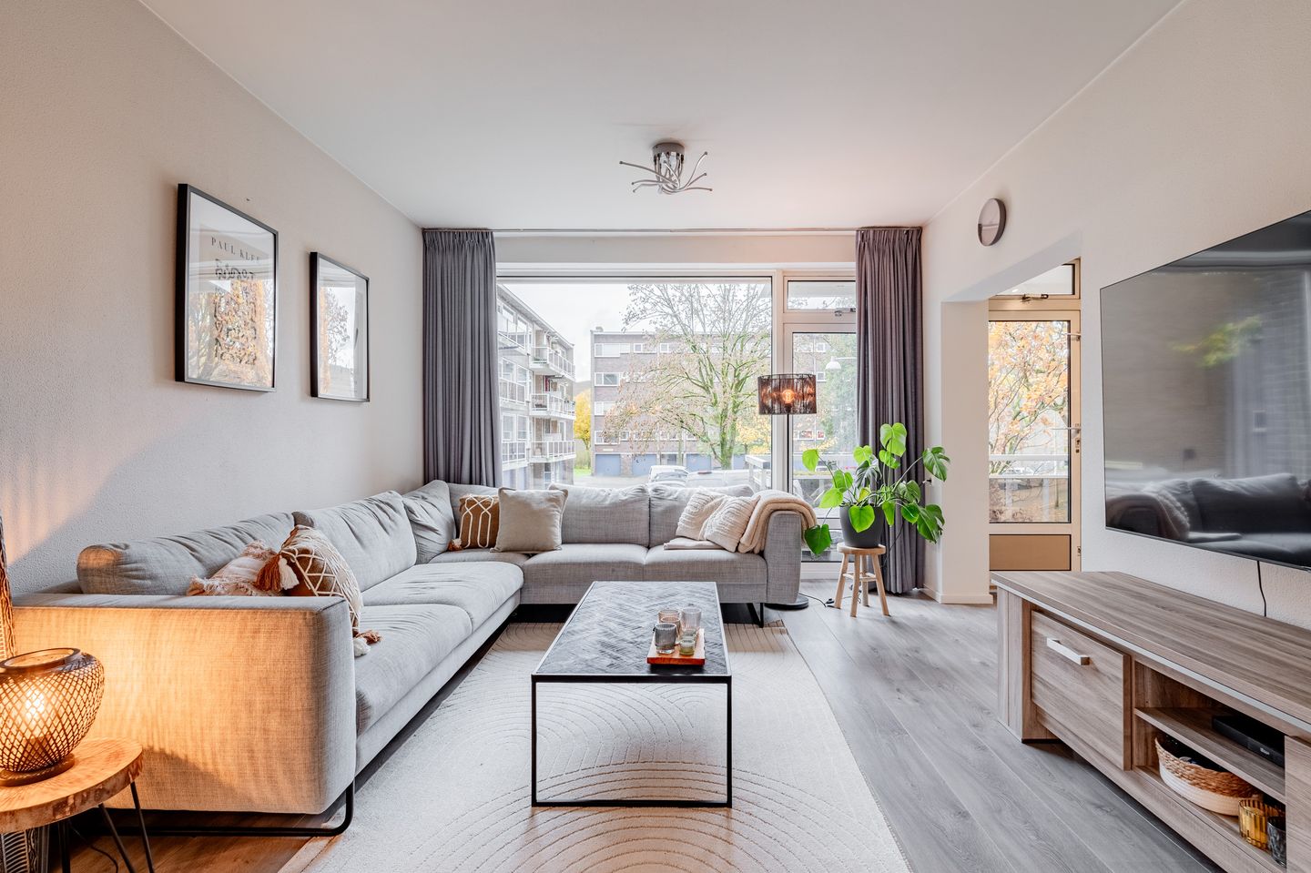 Bij binnenkomst in de hal van het appartement vind je toegang tot de eerste slaapkamer, de badkamer en de woonkamer. De ruime, lichte woonkamer bevindt zich aan de voorzijde en is mede door het hoekraam heerlijk licht!