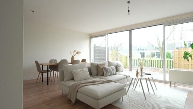 De woonkamer is lekker tuingericht, mede dankzij de brede schuifpui die naar twee kanten geopend kan worden. Hierdoor ontstaat er een prachtige verbinding tussen de tuin en de woonkamer. De achtertuin grenst aan een gemeenschappelijke binnentuin, wat zorgt voor extra groen en een vrij gevoel. De woonkamer loopt naadloos over in de open keuken, die is voorzien van diverse inbouwapparatuur.