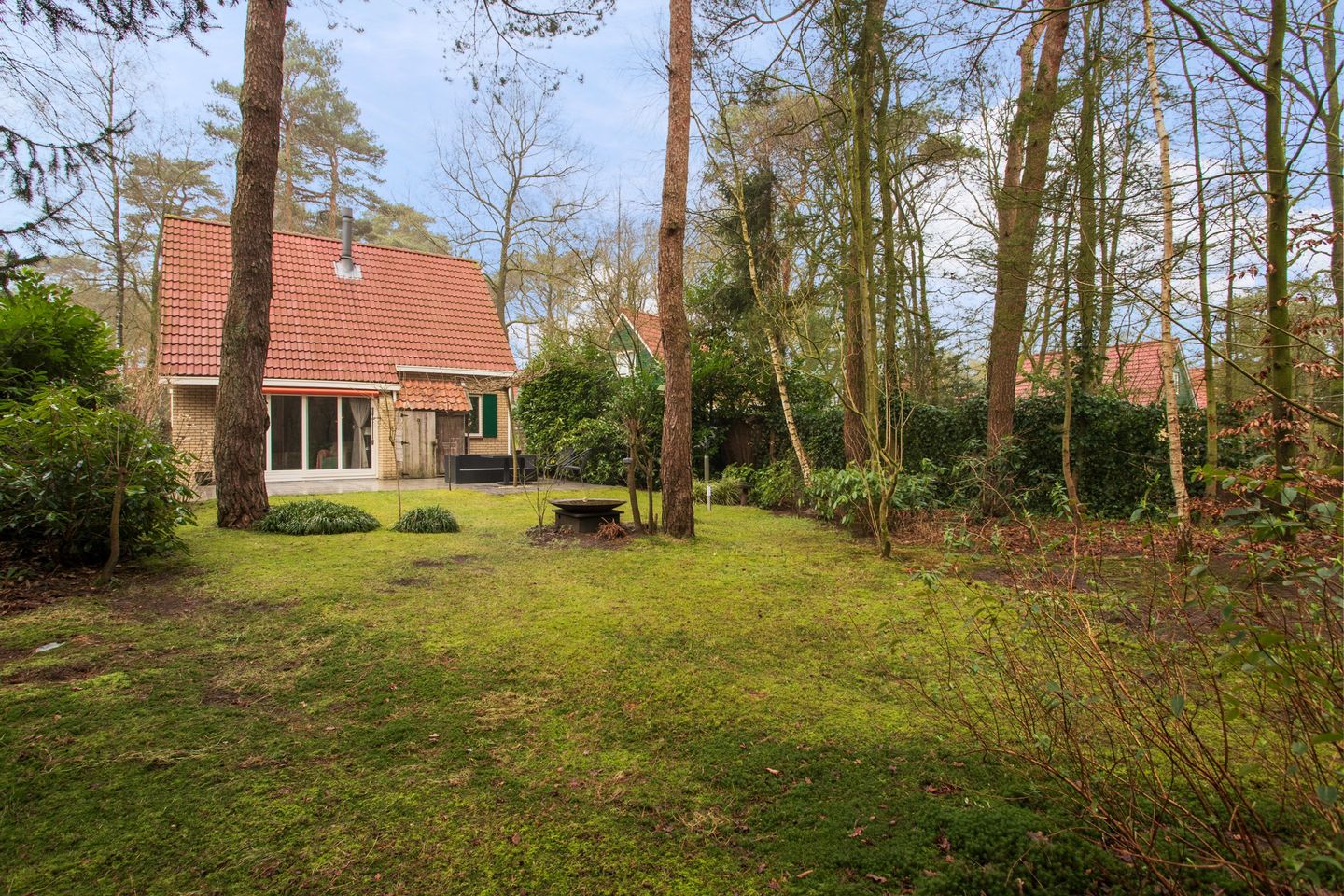 Wat deze recreatiewoning écht bijzonder maakt, is de uitgestrekte buitenruimte. De woning is vrij rondom bereikbaar, met het grootste deel van het perceel gelegen achter de woning, wat zorgt voor een gevoel van ruimte, vrijheid en privacy. De omheinde tuin en omliggende gronden zijn rijk aan volwassen bomen, waardoor je midden in de natuur woont. Direct grenzend aan de woning, bereikbaar via een schuifpui, ligt een ruim buitenterras met keramische tegels en twee elektrische zonneluifels, een perfecte plek om te ontspannen. Een sfeervolle sierschaal met water trekt dagelijks vogels en andere bosbewoners aan, waardoor de natuur altijd dichtbij is. De tuin combineert het beste van twee werelden: een groene, natuurlijke uitstraling, maar toch onderhoudsarm, zodat je optimaal kunt genieten van de rust en ruimte.