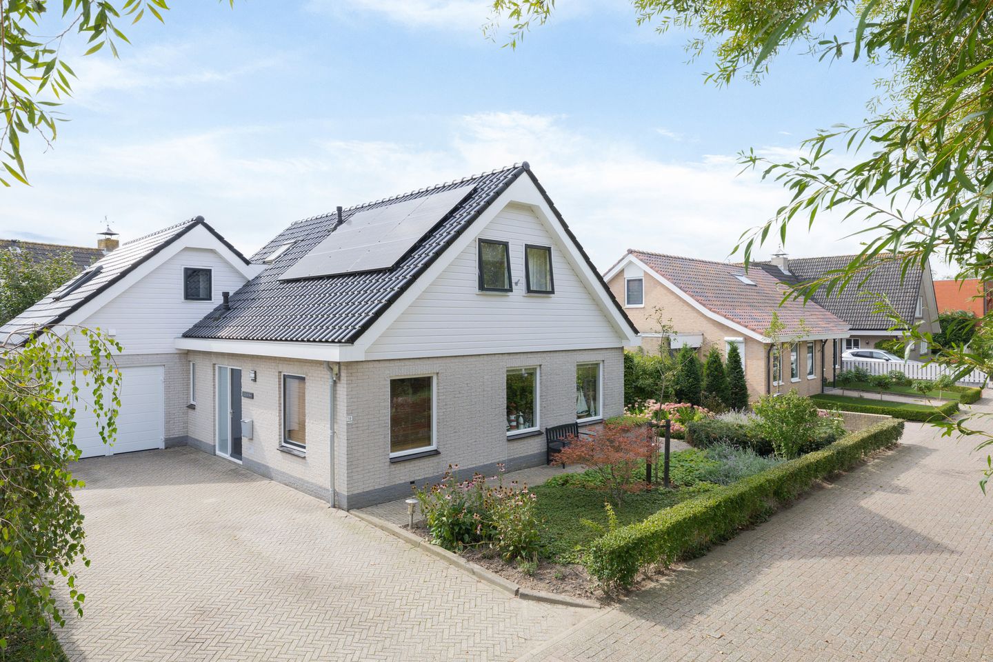 De tuin is rondom de woning gelegen. De achtertuin, gelegen op het zuiden, is voorzien van een ruim terras aan twee zijden van de woning en borders met allerlei planten en struiken. Het is hier heerlijk vertoeven. Achter in de de tuin staat de houten berging. Links van de woning is de inpandige garage met openslaande deuren naar de oprit.