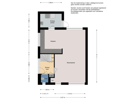 Marmoleumvloer met vloerverwarming, trapkast, meterkast en trapopgang.