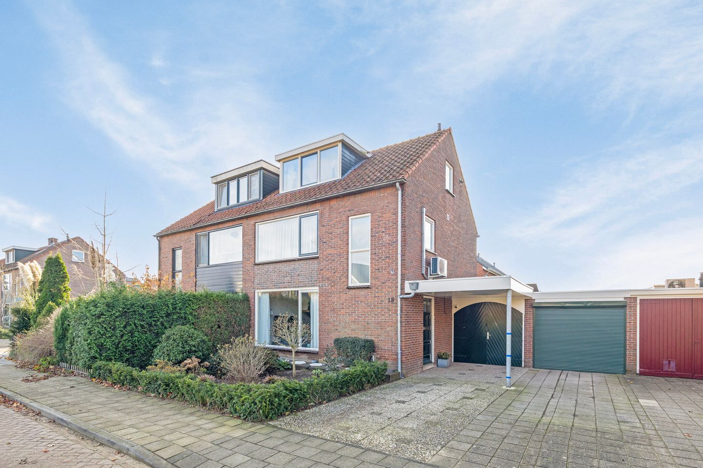 We beëindigen onze tour bij de prettige buitenruimtes. Aan de voorzijde beschikt de woning over een oprit met carport en een fraai aangelegde voortuin. De achtertuin op het zuiden is volledig bestraat, voorzien van een vaste bloembak en een houten overkapping tegen de achtergevel. Daarnaast biedt de tuin toegang tot een vrijstaande schuur en een pad aan de achterzijde. De aangebouwde garage is volledig uitgerust met verwarming, elektra, wateraansluiting en een was opstelling.