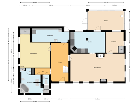 Op de begane grond bevindt zich een ruime entree en een net toilet. Vanuit de hal leidt de weg naar een sfeervolle woonkamer, waar een houtkachel en een eiken houten vloer zorgen voor een warme uitstraling. Aansluitend ligt de halfopen keuken, voorzien van inbouwapparatuur en in landelijke stijl vormgegeven. Dit aaneengesloten geheel met de karakteristieke houten balken geeft deze leefomgeving extra charme. De serre vormt een licht en aangenaam verlengstuk van de woning. Dankzij de vloerverwarming, een tweede houtkachel en een schuifpui naar de tuin is dit een ideale plek om te genieten van de rust en het prachtige uitzicht. Verder biedt de begane grond een studeerkamer/kantoor met vaste kast, een bijkeuken, een ruime nostalgische slaapkamer met vaste (bedstede)-kast en een badkamer met ligbad, dubbele wastafel, douchecabine en een tweede toilet.