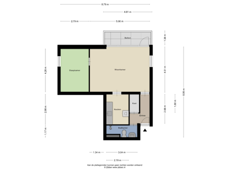 Aan het einde van de hal bevindt zich de verrassend ruime woonkamer. Wat hier direct opvalt is de lichtinval. Vanwege de hoekligging heb je dan ook vanuit verschillende richtingen lichtinval en vrij uitzicht. Via de woonkamer is het balkon te bereiken en deze is op het zuiden gericht.