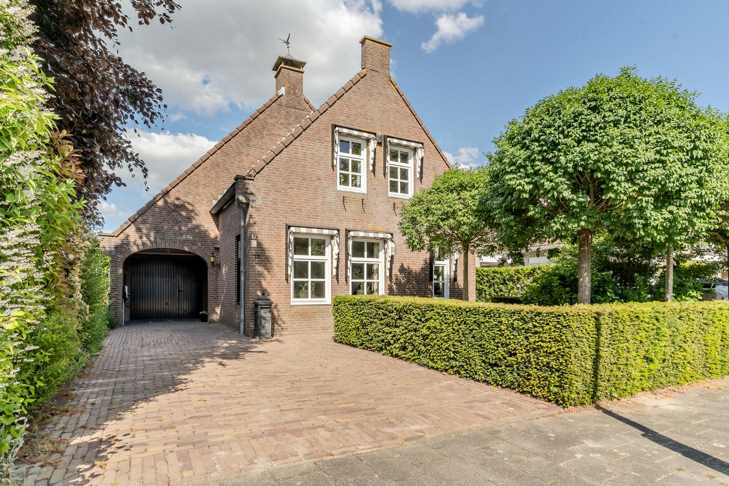 Een royale oprit met carport biedt ruimte voor meerdere auto’s. De overkapping leidt naar de stijlvolle voordeur.