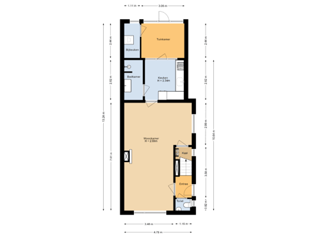 Aan de achterzijde bevinden zich momenteel de keuken en de badkamer. Deze indeling biedt uitstekende mogelijkheden om de begane grond te transformeren tot een ruime woonkeuken met directe verbinding naar de tuin (zie artist impressions). Tevens bestaat de mogelijkheid om de badkamer naar de eerste verdieping te verplaatsen, waardoor de leefruimte op de begane grond aanzienlijk kan worden vergroot.