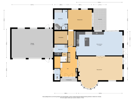 Indeling: royale hal met een garderobekast, ruim toilet met een wastafel, via openslaande deuren naar de sfeervolle woonkamer voorzien van een zandstenen schouw met een gashaard, fraaie ronde erker, openslaande tuindeuren en openslaande deuren naar de royale woonkeuken voorzien van een koelkast, 5-pits gaskookplaat, afzuigkap, afwasmachine, oven, combimagnetron en een granieten aanrechtblad, bijkeuken met een keukenblok voorzien van een spoelbak, aansluiting voor de wasmachine, bergkast en toegang tot de grote dubbele garage, slaapkamer met kleedruimte, schuifpui naar het overdekte terras en openslaande tuindeuren, badkamer voorzien van een ligbad (whirlpool), grote inloopdouche, meubel voorzien van een dubbele wastafel en een spiegelkast, separaat toilet.