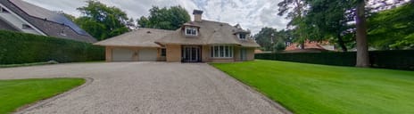 Op een royaal perceel nabij de bossen en openbaar vervoer gelegen, charmante rietgedekte VILLA met 6 slaapkamers, een dubbele garage en een tuin op het zuiden met een houten tuinhuis en optimale privacy.