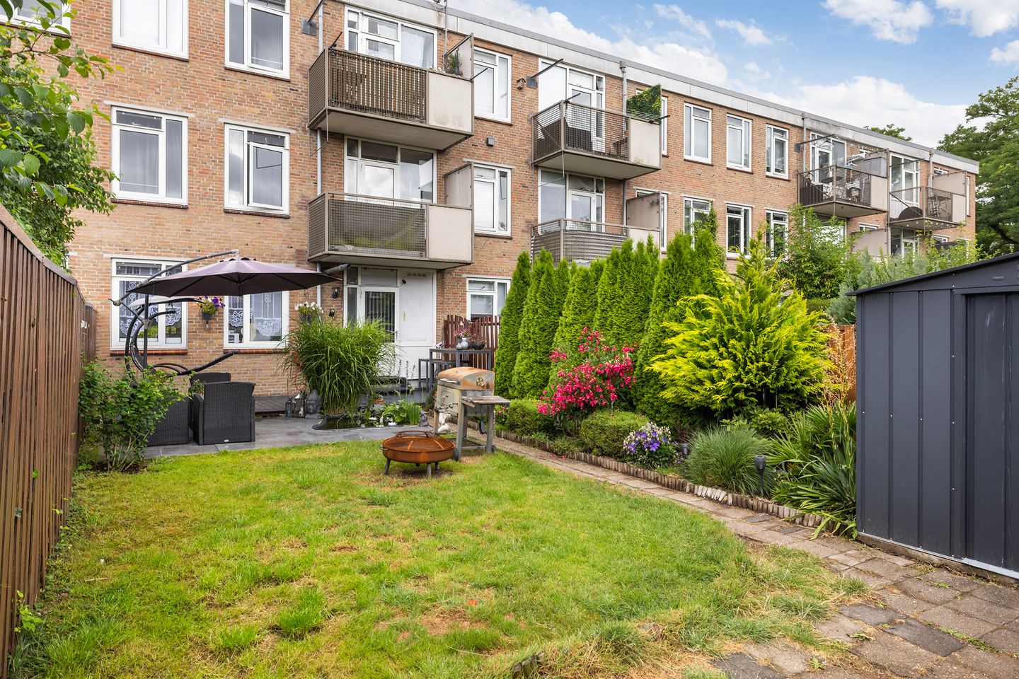 De ruim 16 meter diepe achtertuin is georiënteerd op het noordoosten en beschikt over een afsluitbare achterom, buitenkraan, elektra en een vrijstaande stenen berging, voorzien van elektra. Vanwege de diepte is er altijd een plekje voor zon of schaduw. Daarnaast beschikt het appartement nog over een voortuin gelegen op het zuidwesten.