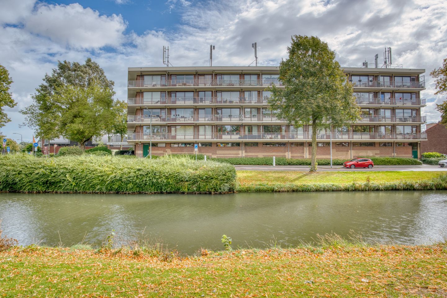 Het woning brede balkon biedt uitzicht over een waterpartij en de rotonde bij de Viottakade.