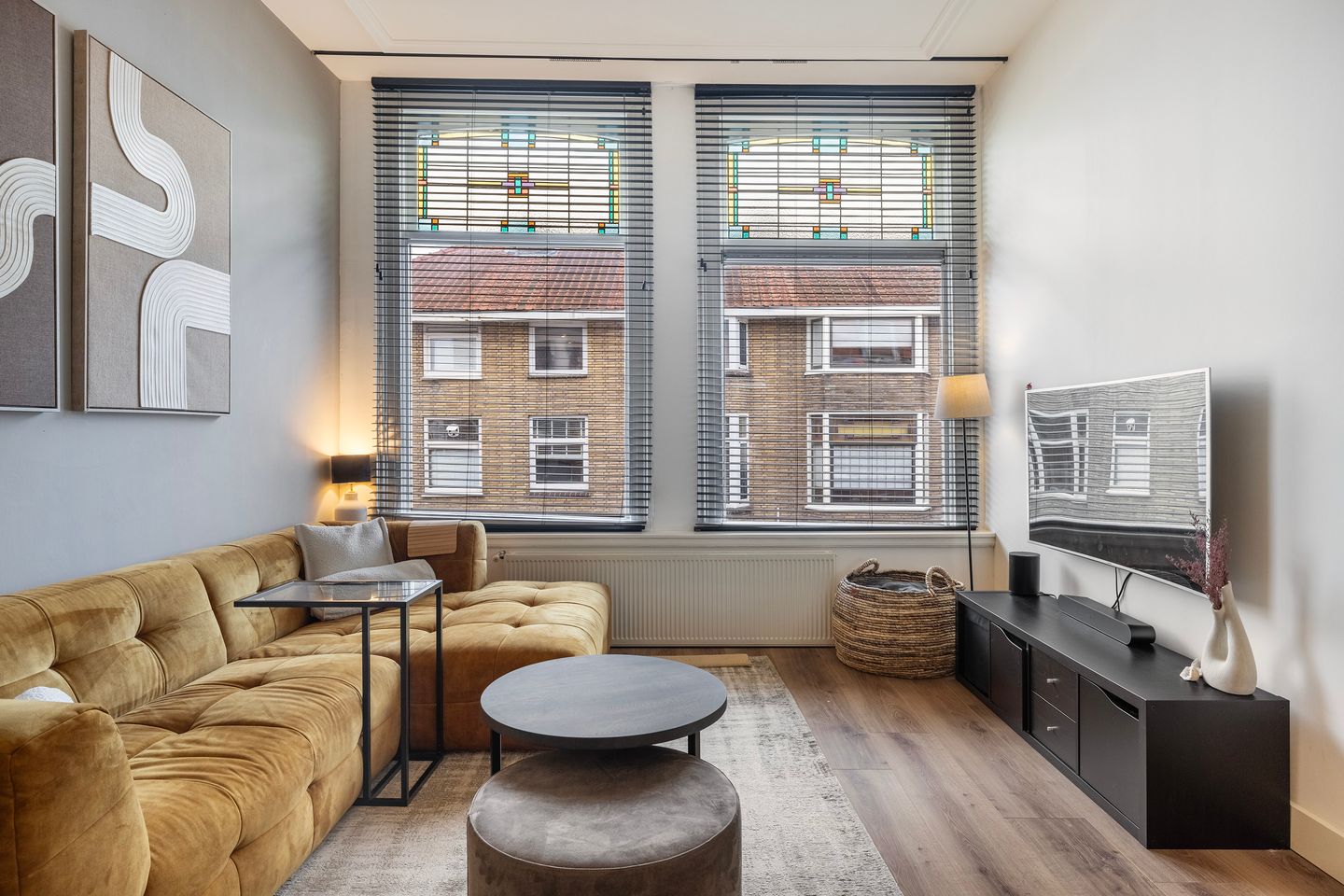 Zeer ruime en lichte woonkamer met gave, enorm hoge plafonds en sierlijsten. De woonkamer heeft dubbele beglazing en aan de voorzijde sfeervolle glas in loodramen.