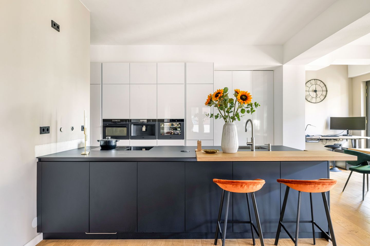 De keuken in de ruimte is in 2022 gloednieuw geplaatst en een parel voor het oog. Uiteraard is deze van alle gemakken voorzien: een AEG inductie kookplaat met afzuiging, Quooker, wijnklimaatkast, koffiezet apparaat, stoomoven, koelkast, vaatwasser en een keramisch blad als afwerking. Er is goed nagedacht aan veel kastruimte in de keuken. De keuken is ingericht met een wandopstelling en een schiereiland.