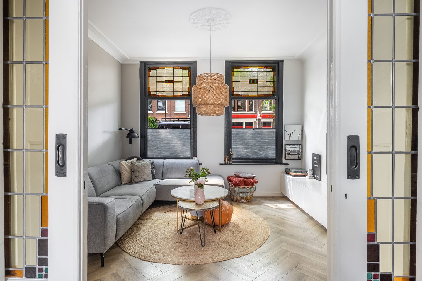 Slaapkamer (voorheen de woonkamer van de bovenwoning) met grote inloopkast en vensterbank. De ruimte beschikt over glas-in-loodramen in dubbel glas. Er is naast de vaste inloopkast een kasteneiland aanwezig (ter overname) en via een stalen pui kom je in een zij kamer die je super leuk als bijvoorbeeld make-up kamer kan gebruiken.