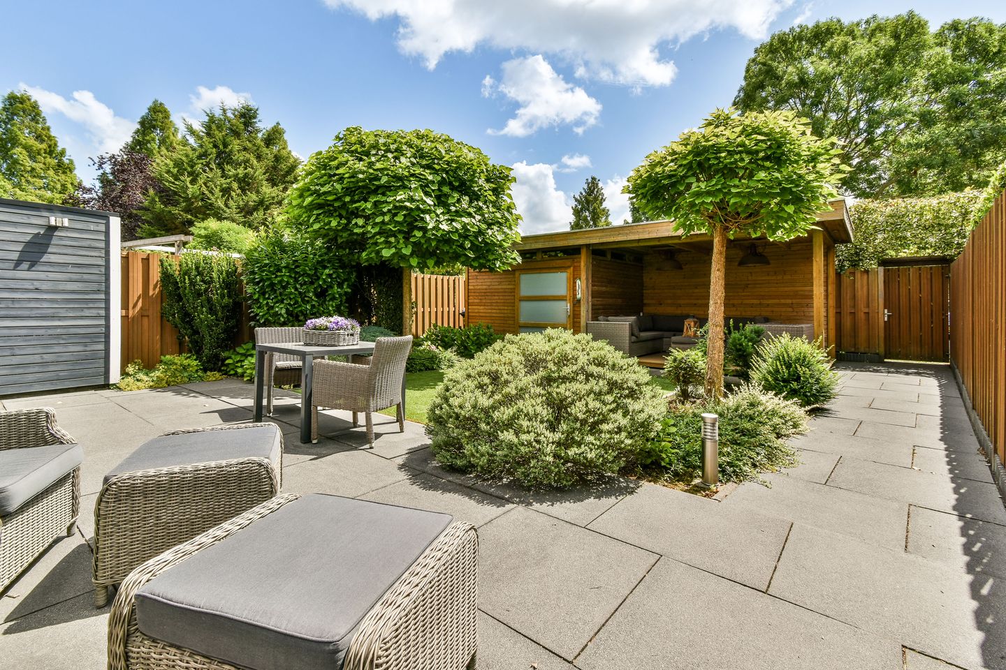 - De achtertuin is gesitueerd op het zuiden en is strak aangelegd met bestrating en beplanting. Achterin de tuin staat een houten berging met een ruime aangebouwde overkapping. De achtergevel beschikt over een elektrisch bedienbaar zonnescherm en een buitenkraan. Tevens is er een achterom aanwezig.