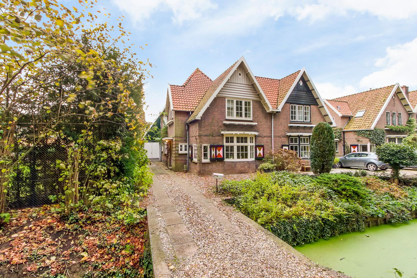 - Pandbrede voortuin: ca. 4.50 meter diep, gesitueerd op het westen en aangelegd met een grindborder en planten naar de waterkant;