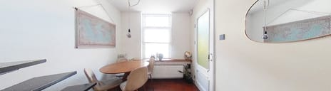 Grote open ruimte, momenteel in gebruik als werk-/studeerkamer, met deur naar het royale dakterras en vaste trap naar de slaapvide in de nok. Je kunt hier makkelijk een slaapkamer van maken en de vide als bergruimte gebruiken.