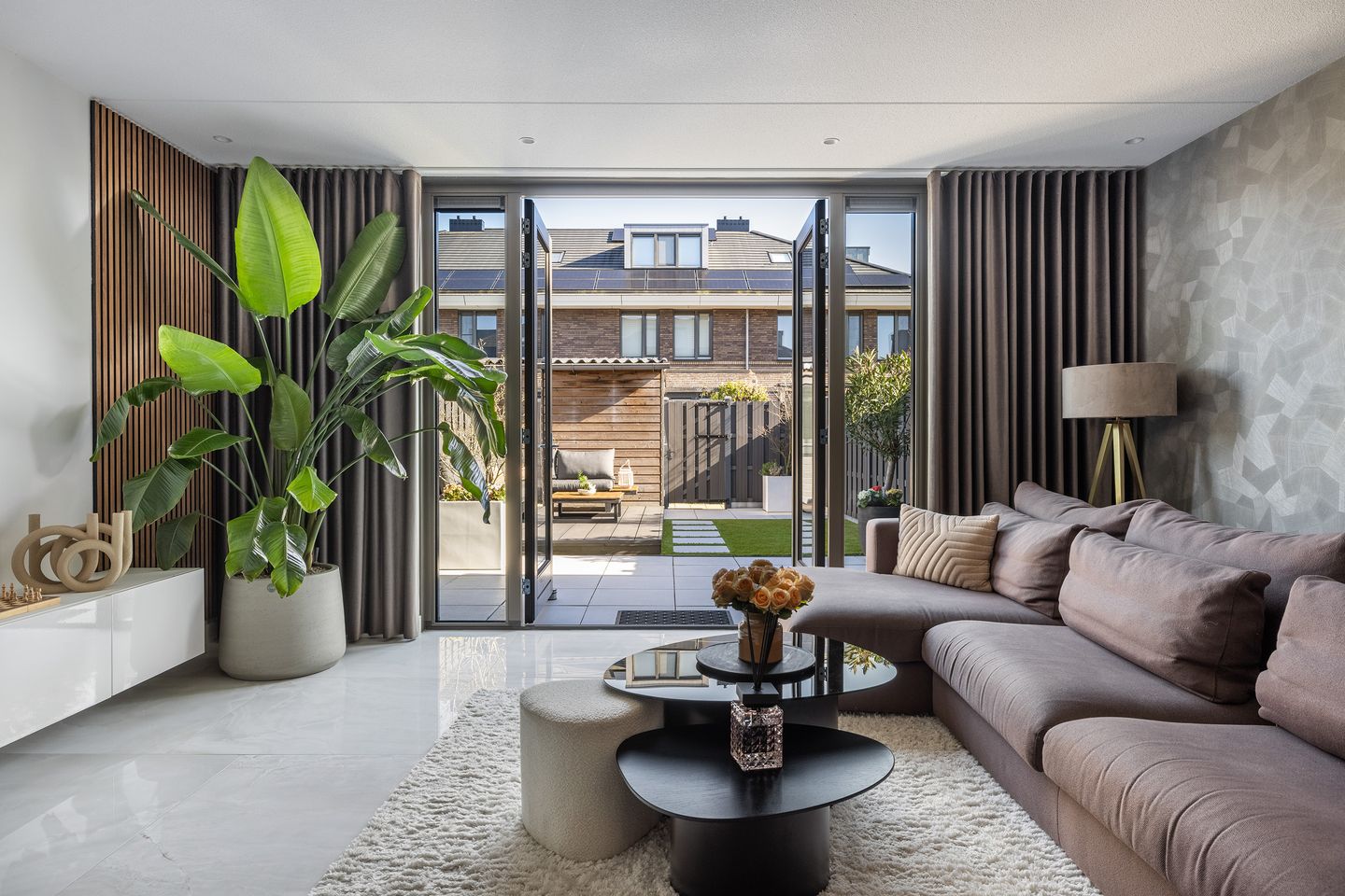 De woonkamer is heerlijk licht dankzij de grote ramen en openslaande deuren naar de achtertuin. De plavuizen vloer met vloerverwarming zorgt voor een comfortabele sfeer.
