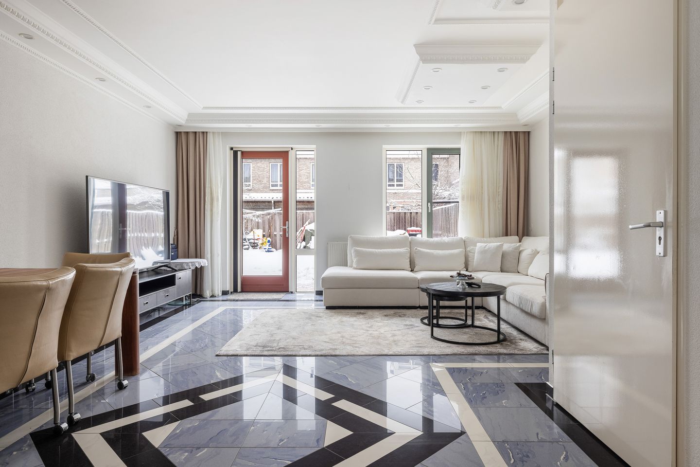 Heerlijke grote woonkamer met aan de achterzijde een deur naar de tuin en aan de voorzijde de open keuken. In de kamer zijn meerdere delen van het plafond iets verlaagd en voorzien van sierlijsten en LED spots. De gehele begane grond is voorzien van een Italiaanse plavuizen vloer en spachtelputz wanden. Grote trapkast in de kamer voor de voorraad en bijvoorbeeld de stofzuiger.