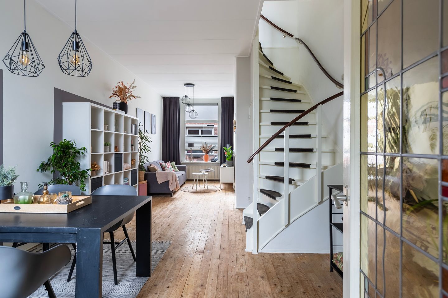 Charmante woonkamer met trap naar de verdieping, trapkast en mooie glas-in-lood deur naar de keuken. Door het hoge plafond voelt de woonkamer heel ruimtelijk.