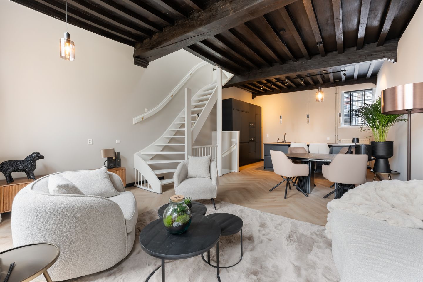 - royale open woonverdieping met hoog plafond, balken en grote raampartijen;