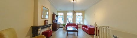 Via de trap bereik je de lichte woonkamer aan de voorzijde. Wat meteen opvalt zijn de hoge plafonds en de originele schouw. En-suite deuren met glas-in-lood verbinden de kamer met de royale woonkeuken aan de achterzijde, compleet met allesbrander. De keuken in U-opstelling is volledig uitgerust met o.a. een 5-pits gasfornuis, oven, vaatwasser, combimagnetron en koel-/vriescombinatie. Aangrenzend vind je de eerste badkamer met ligbad, toilet en wastafel.