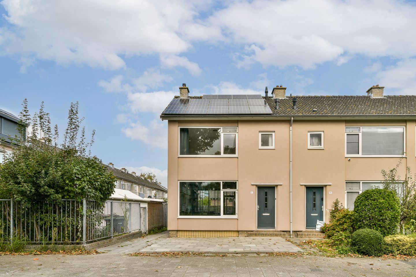 Aan de voorzijde van de woning ligt een diepe, volledig betegelde voortuin. Deze nette en onderhoudsvriendelijke ruimte biedt volop mogelijkheden voor het plaatsen van bijvoorbeeld een zitje, plantenbakken of een fietsenrek.