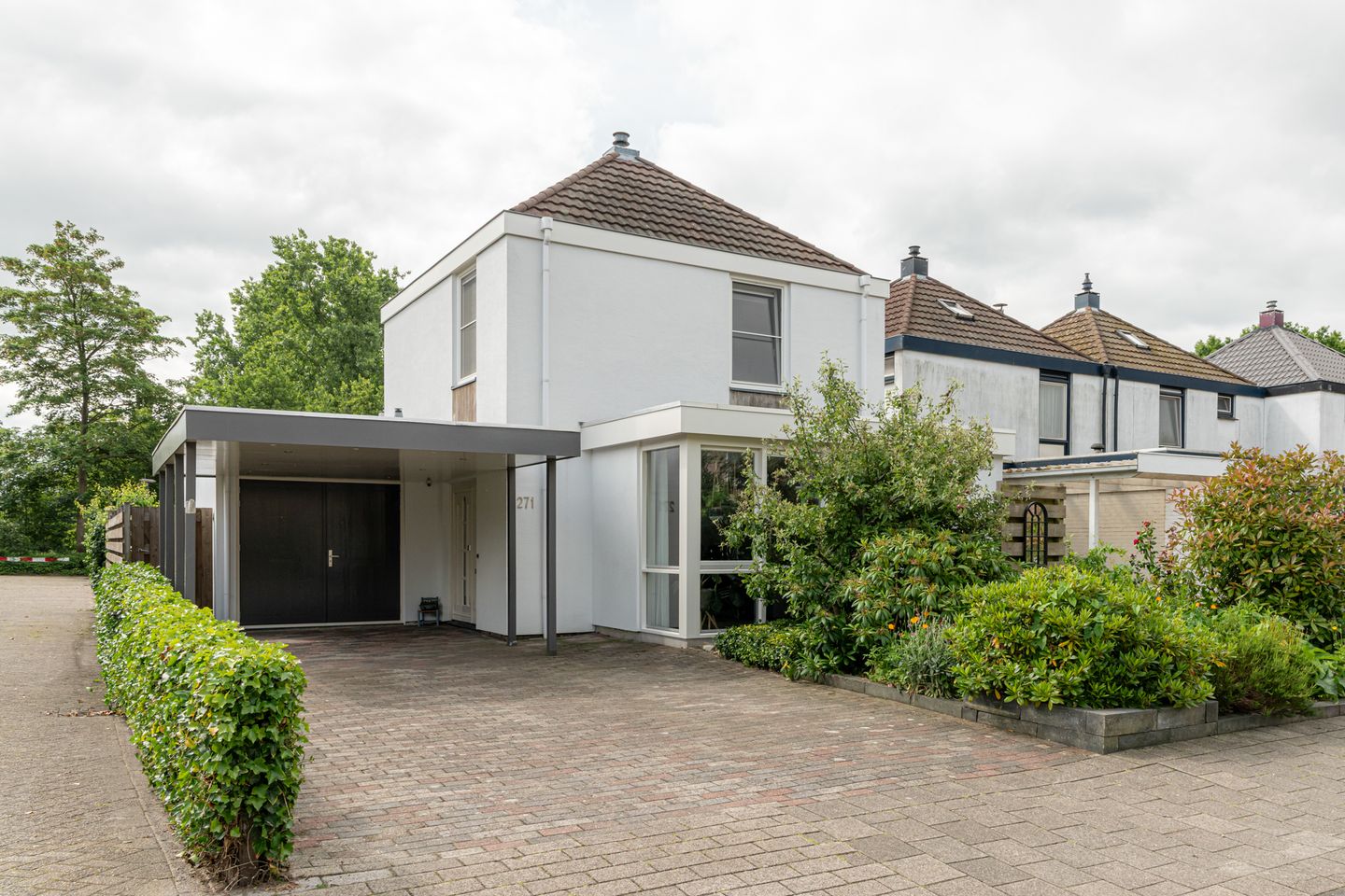 Je komt binnen via de voordeur onder de carport. In de hal tref je het gemoderniseerde toilet, een uitgebreide meterkast en de trapopgang naar de verdieping.