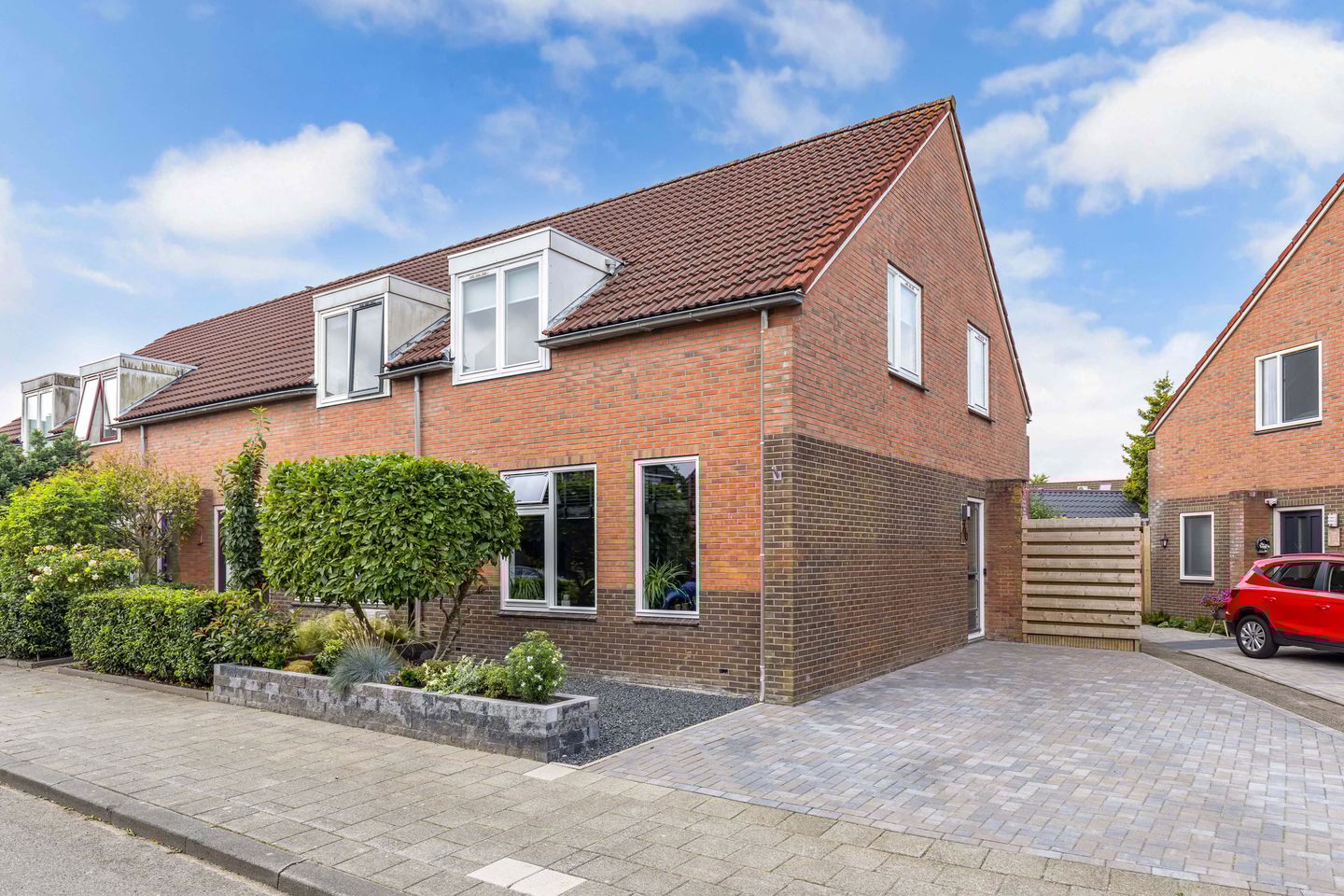 Door de hoekligging heb je een grote tuin om het huis. De achtertuin ligt op het zonnige zuidwesten en is modern en onderhoudsvriendelijk aangelegd met grote natuurstenen tuinplavuizen en een klein gazon omzoomd door drainage. Achter in de tuin is de berging voor de fietsen en tuinspullen en met een kleine overkapping voor een koel schaduwplekje. Het dak en de zijgevels zijn geïsoleerde panelen en de voorgevel zijn onderhoudsarme rabatdelen. Ook hier heb je geen inkijk en veel privacy. Achter de tuin is gemeentegroen met een klein speelveldje. Naast de woning is een klikohoekje en een schuttingdeur naar een pad dat je deelt met één buur. De voortuin is een fraai aangelegde bordertuin en een mooie bonus van het huis is dat je een eigen oprit hebt voor minimaal twee auto's!