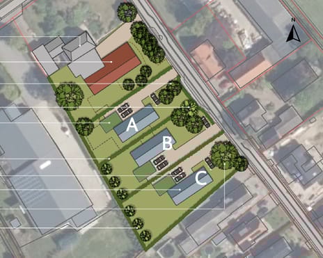 Een kaart zonder maten die de ligging van de percelen aangeeft. Bevat grenzen en perceelnummers.