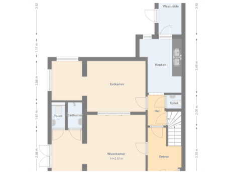 Via de ruime entree, voorzien van meterkast en toilet, is er toegang tot de woonkamer. Vanuit de hal leidt een tochtdeur naar een tweede hal, die toegang biedt tot de kelder, toilet met wastafel, de eetkamer en de keuken.