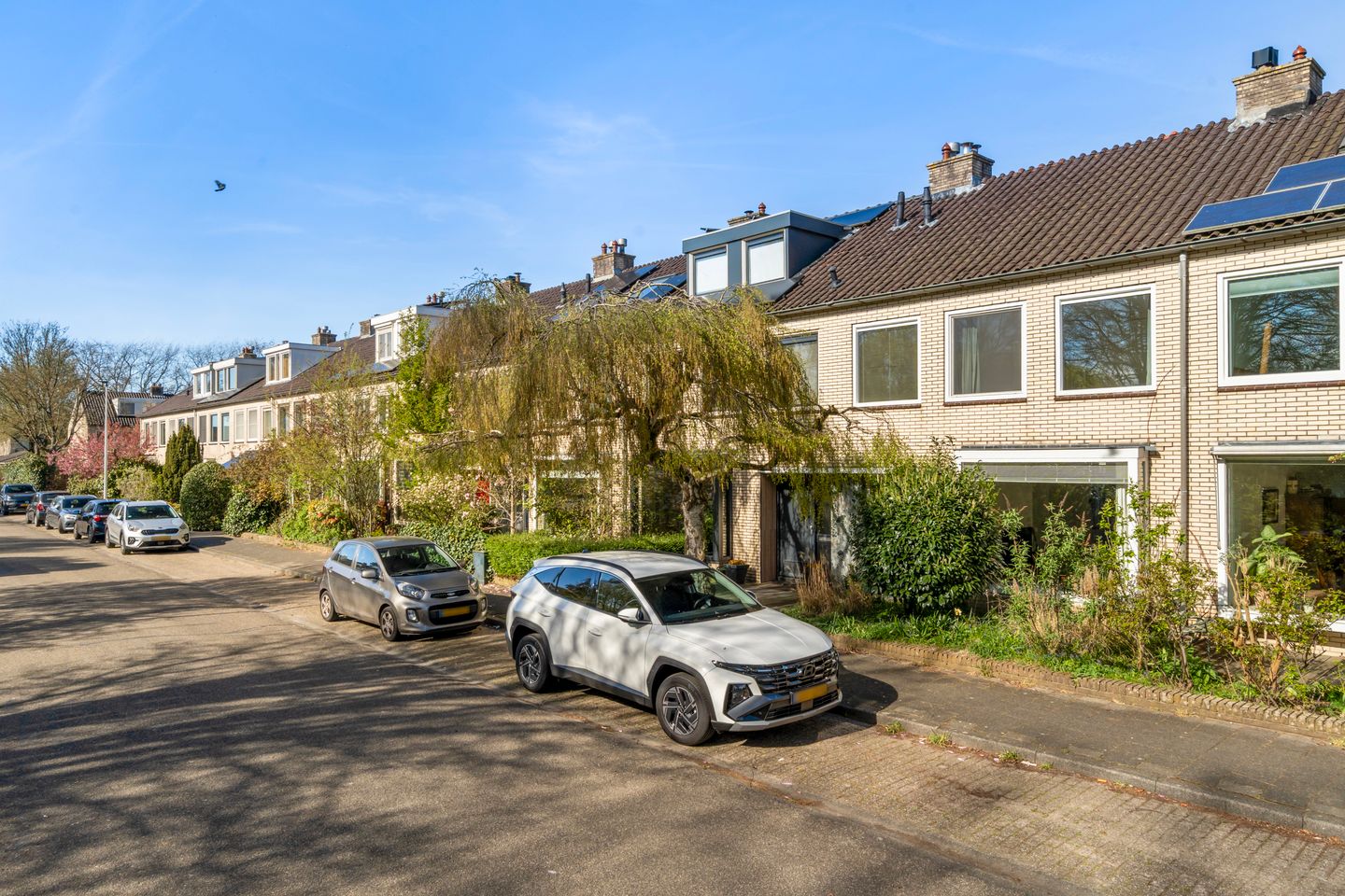 The property features both a front garden and a well-maintained backyard with rear access, ideal for families and convenient bicycle storage. The backyard provides ample space for relaxing, dining outdoors, or children to play safely. At the front of the house, you enjoy open views over a green playfield, enhancing the sense of space and making this an ideal setting for families with children.
