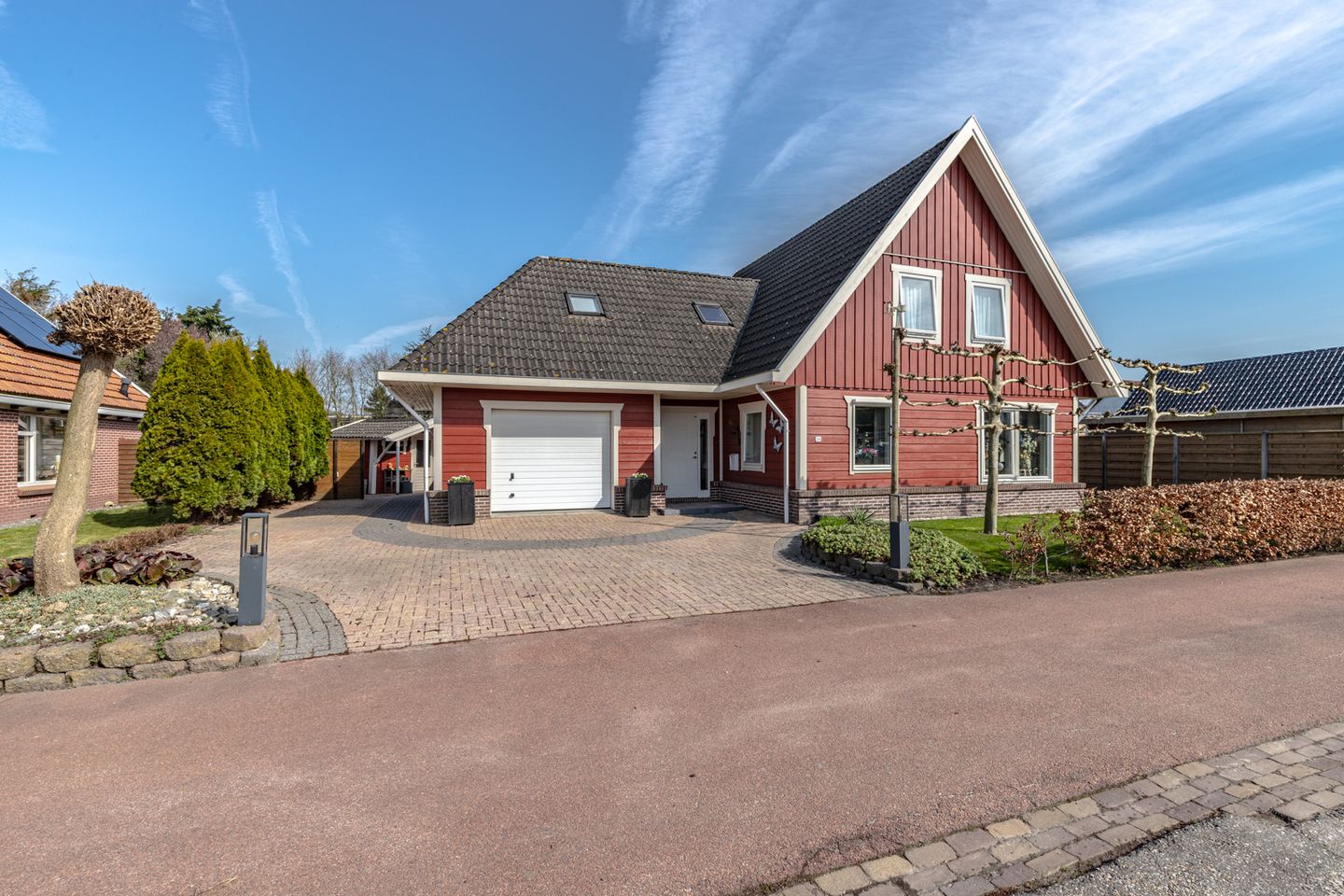 Vrijstaand huis met 4 slaapkamers, inpandige garage en gelegen aan een rustig straatje. Het is een echte Zweedse woning: het is namelijk gebouwd en onderhouden zoals het hoort. Van buiten zie je dat o.a. aan de rood geverfde houten gevelbekleding. En ja, dat moet af en toe geverfd worden (1x in de 10 jaar) maar daar hoef je geen schildersopleiding voor te hebben. Van binnen geven de grenen deuren en de kraalschroten in de hal en op de overloop een knus en natuurlijk gevoel. Een groot voordeel van Zweedse woningen is dat ze goed zijn geïsoleerd en ademend. Dus warm in de winter, koel in de zomer en een gezond binnenklimaat. En last but not least: deze houtskeletbouw is aardbevingbestendig. Maar dat is in dit geval minder relevant want Drieborg ligt niet in het aardbevingsgebied (het zogenaamde effectgebied).