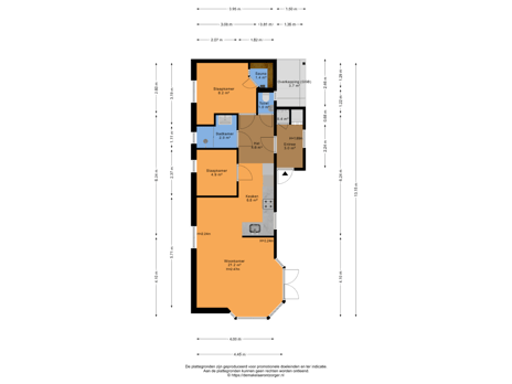 • Badkamer (ca. 3 m²): voorzien van een wastafelmeubel en een douchecabine met schuifdeuren.