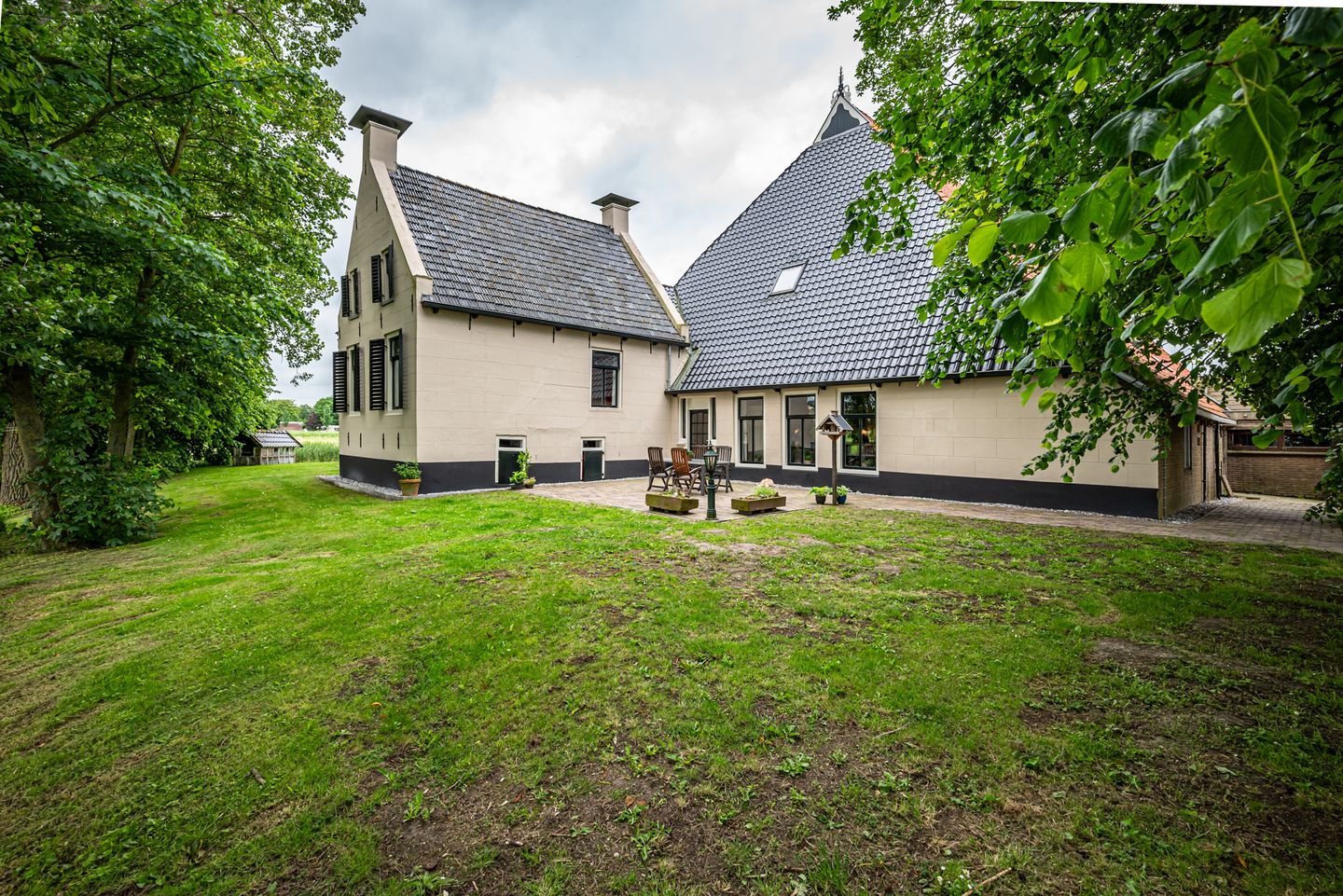 Rondom de woning een verzorgde tuin ingericht met sierbestrating, diverse borders, gazon en veel groen. Vanaf hier is er een fraai uitzicht over de aangrenzende landerijen.