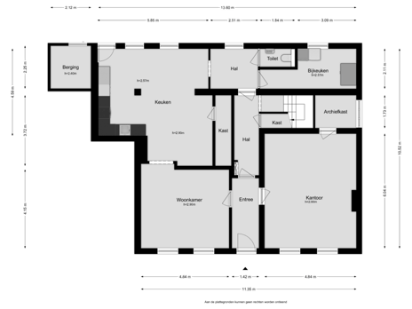 Achter de originele, gerestaureerde voordeur ligt een gang die betegeld is in de stijl van de jaren dertig. Aan het einde hiervan is de trapopgang, bordestrap, naar de bovenverdieping. Aan de rechterzijde van de gang bevindt zich een ruime kamer (ca. 29m2). Deze is nu in gebruik als werkkamer, maar kan ook dienen als kantoor aan huis. Aan deze werkkamer grenst een kleinere ruimte die nu benut wordt als archief, maar waar zich ook aansluitingen bevinden voor douche, wastafel en WC. Hier kan met weinig moeite een badkamer ingericht worden, waardoor op de begane grond levensloopbestendig wonen mogelijk is. Aan de linkerkant van de gang is een deur naar de woonkamer, die evenals de werkkamer beschikt over een origineel balkenplafond en ca. 2.90m hoog is. De woonkamer loopt over in een grote ruimte, die dient als keuken annex eetkamer, eveneens met een balkenplafond. Deze woonkeuken vormt het centrum van het huis. Het in hoogglans wit uitgevoerde kookgedeelte uit december 2019 is voorzien van een vaatwasmachine, kokend waterkraan, inductie kookplaat met afzuigkap, magnetronoven, bakoven en koelkast en heeft een natuurstenen aanrechtblad en achterwand. Tenslotte is hier ook nog een praktische inloopkast van ca. 3 m2. Aan de achterkant van de keuken geeft een deur toegang tot de tuin.