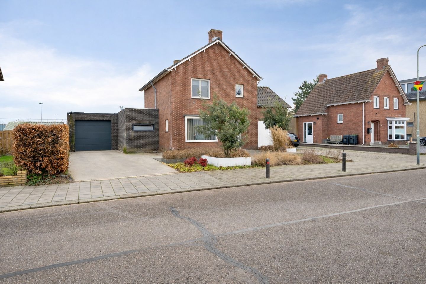 Aan straatzijde biedt de woning een dubbele oprit met parkeergelegenheid voor diverse auto's. Aan de rechterzijde van de woning is een (eenvoudige) houten garage/berging beschikbaar en aan de linkerzijde biedt de woning een riante volwaardige stenen garage met sectionaalpoort. Deze garage of werkplaats is ruim 11 meter diep en 3.47/4.78 meter breed, opgetrokken met geïsoleerde spouwmuur en een geïsoleerd plat dak.