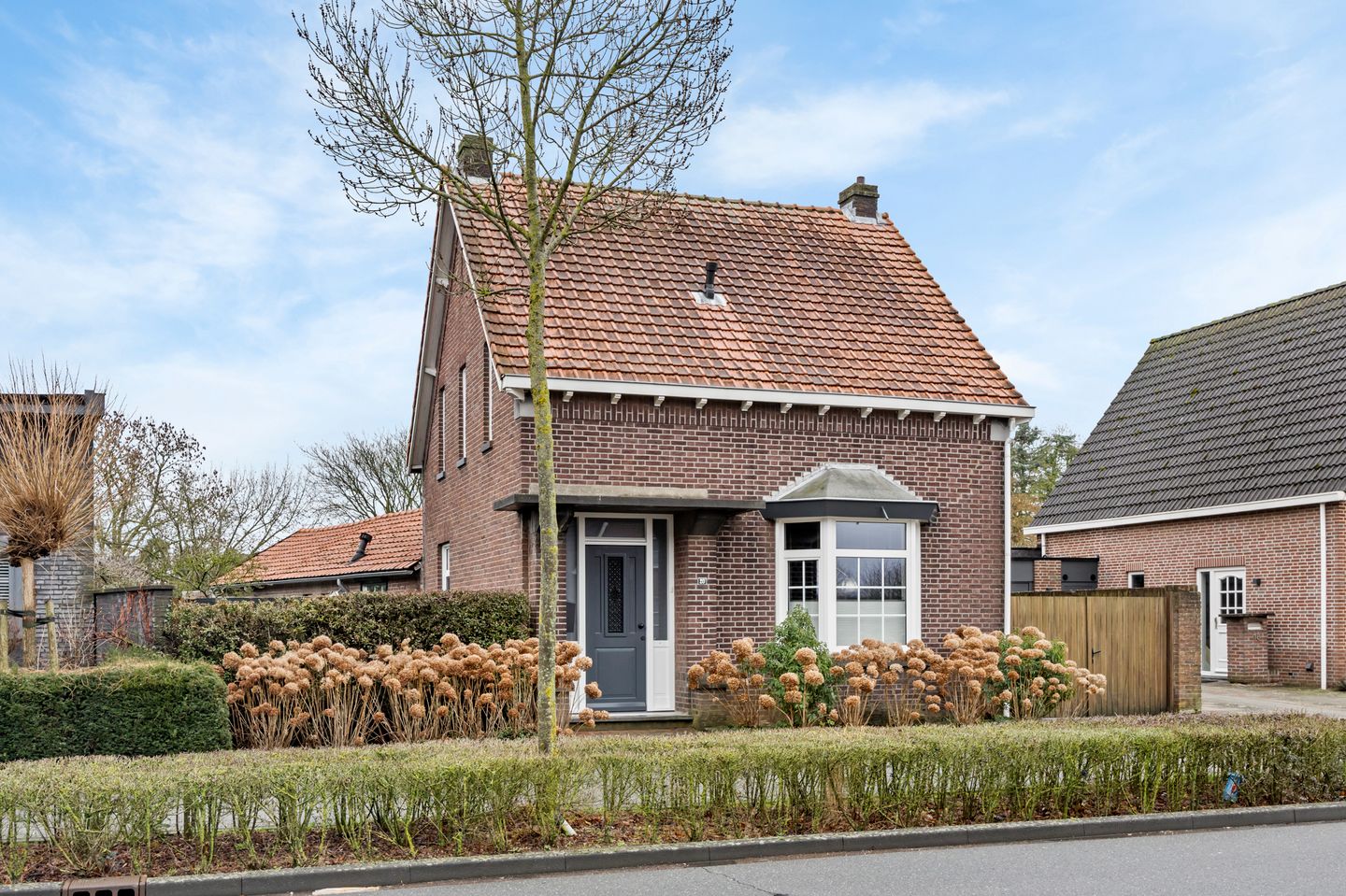Aan de rechterzijde van de woning bevindt zich een ruime oprit met parkeergelegenheid voor 2 à 3 auto’s. De toegangspoort biedt bovendien een brede en praktische doorgang naar de achtertuin.