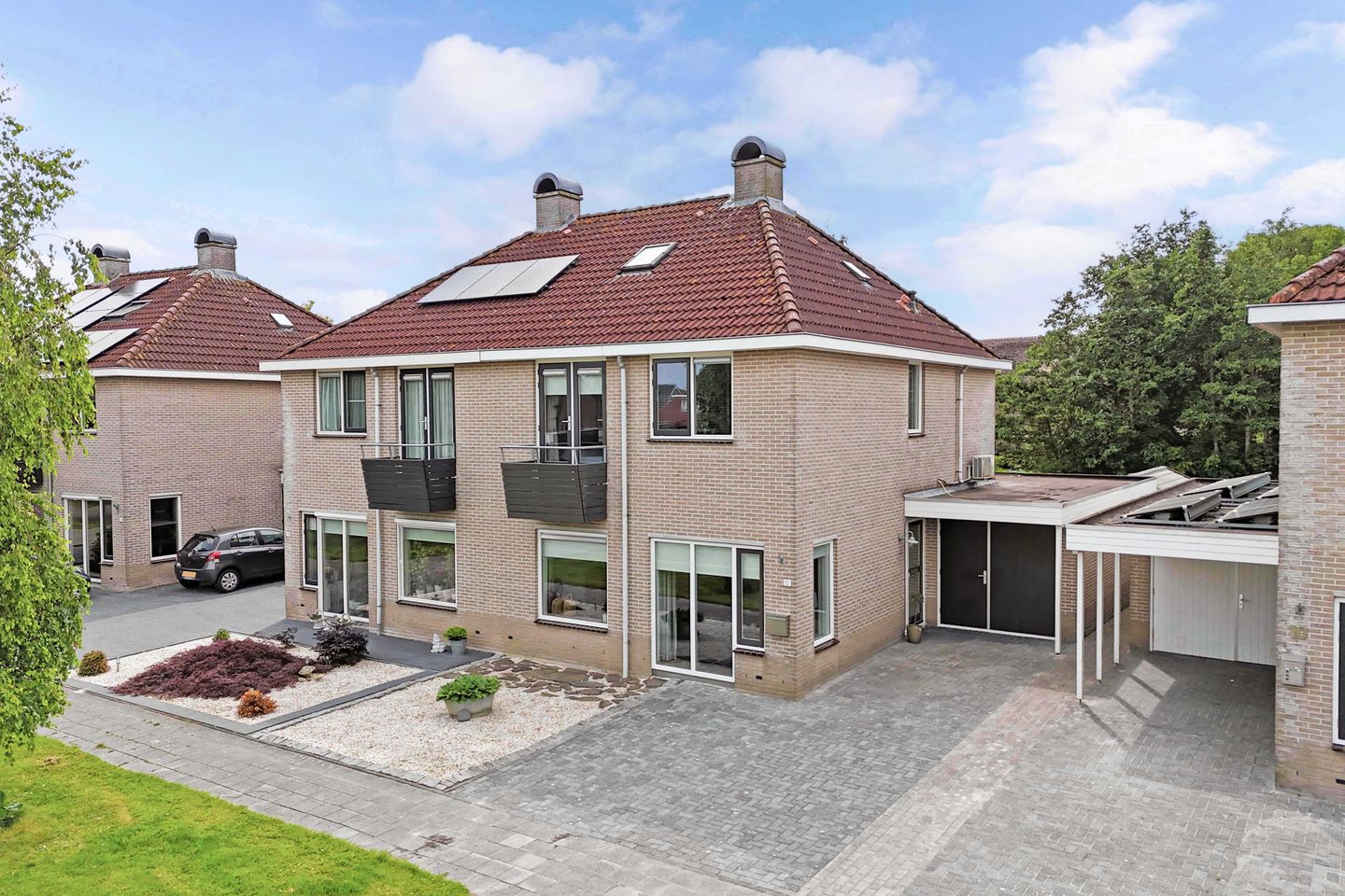 Voor het huis ligt een royale oprit met plek voor meerdere auto's.