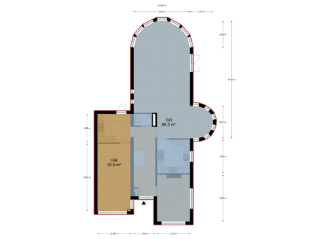 Begane grond: entree, meterkast, ruime hal studeer/werk/slaapkamer alsmede toilet en een praktische bijkeuken. De fraaie en riante woonkamer heeft een fraaie ronde gevel met veel lichtinval. Vanuit de woonkamer is de heerlijke tuin te bereiken en de keuken is voorzien van inbouwapparatuur.