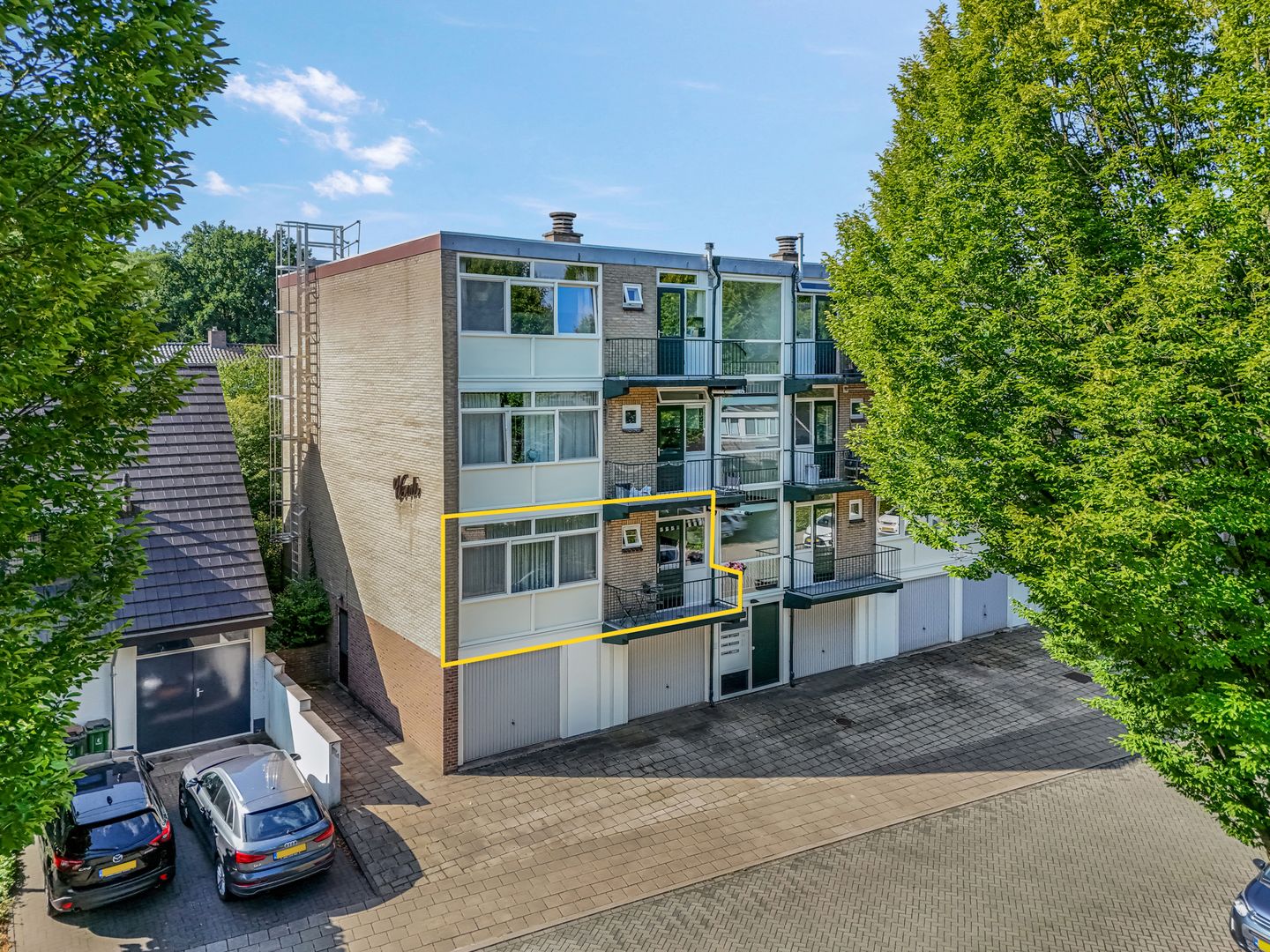 Het appartement maakt deel uit van een kleinschalig complex met slechts twaalf appartementen. De entree (die gedeeld wordt met zes appartementen) met bellentableau, brievenbussen en intercom bevindt zich aan de buitenzijde. Een trap leidt naar de eerste verdieping, waar dit hoekappartement zich aan de linkerzijde bevindt.