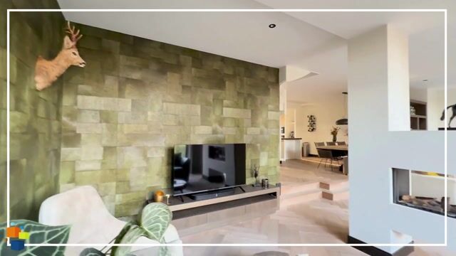 Via een splitlevel bereikt u het lager gelegen loungegedeelte met weids uitzicht. Het tv-gedeelte wordt sfeervol afgescheiden door een open gashaard. De volledig glazen achtergevel zorgt voor een overvloed aan daglicht.