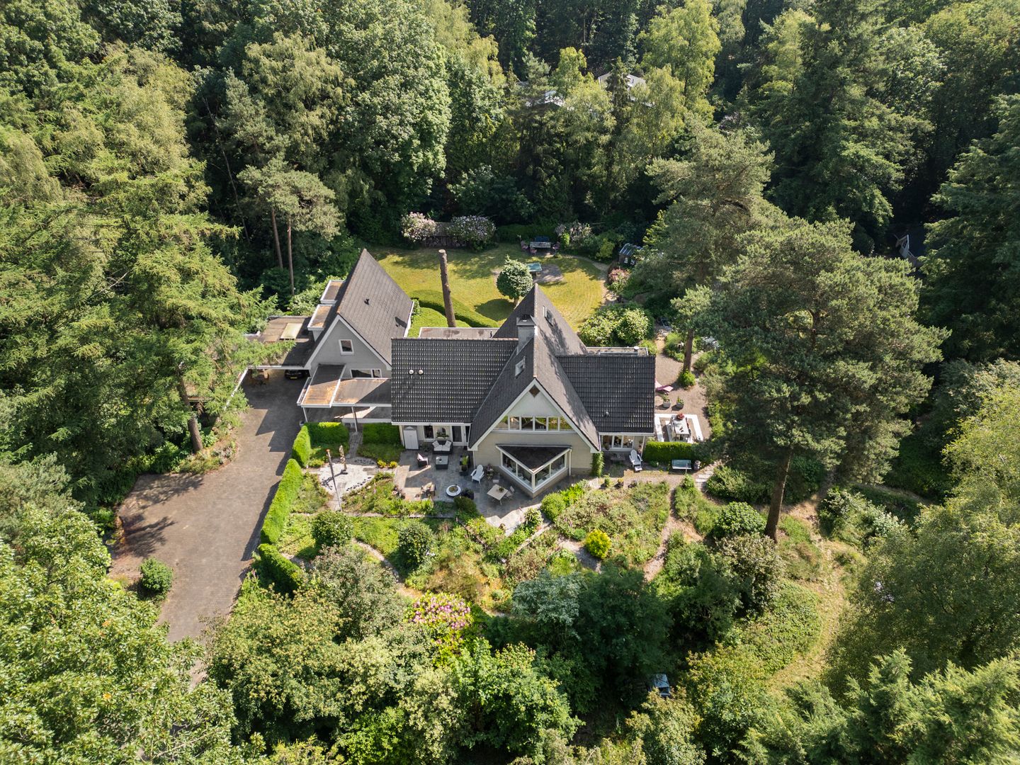 Een ware blikvanger is de zwemvijver, een prachtige toevoeging aan de tuin die uitnodigt tot een verfrissende duik. Naast de vijver ligt een fraai vlonder, perfect om te loungen en te genieten van de serene omgeving. De hoge bomen en groenblijvende beplanting bieden een natuurlijke afscherming en versterken de privacy, zodat u in alle rust van uw tuin kunt genieten. Deze villa is uitermate geschikt voor wie waarde hecht aan comfort en privacy in een groene omgeving.