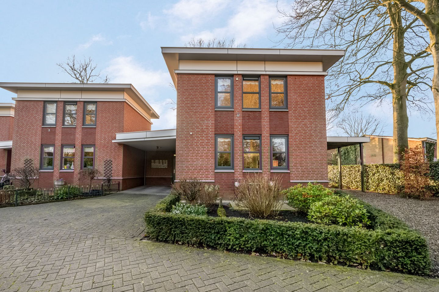 Aan het einde van het straatje staat deze fraaie, geschakelde woning. Aan twee kanten is een oprit, beide met een carport. Zo is er altijd parkeergelegenheid op eigen terrein, ook voor een aanhangwagen, caravan of camper. De entree, met de voordeur en een deur naar de (fietsen)berging, is bij de carport aan de linkerzijde.