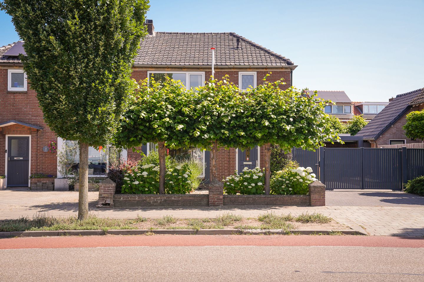 Al bij aankomst valt de voortuin op: strak onderhouden, met een rij leibomen en kleurrijke beplanting. De brede oprit biedt ruimte voor meerdere auto’s en wordt afgesloten met een stijlvol, elektrisch hek – een combinatie van comfort en veiligheid.